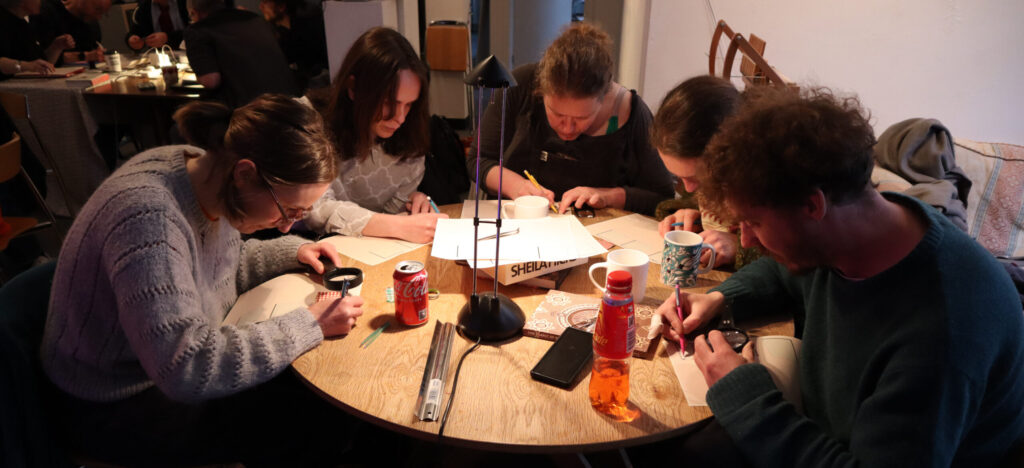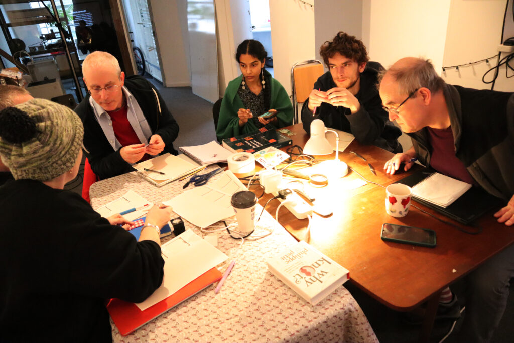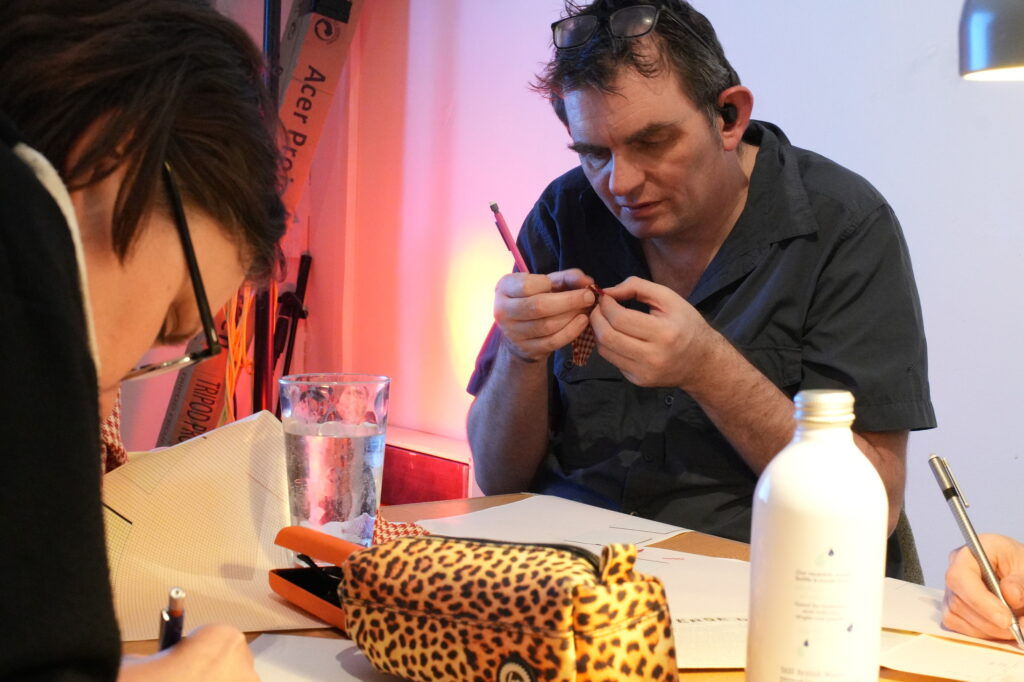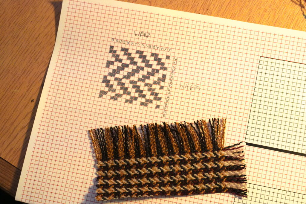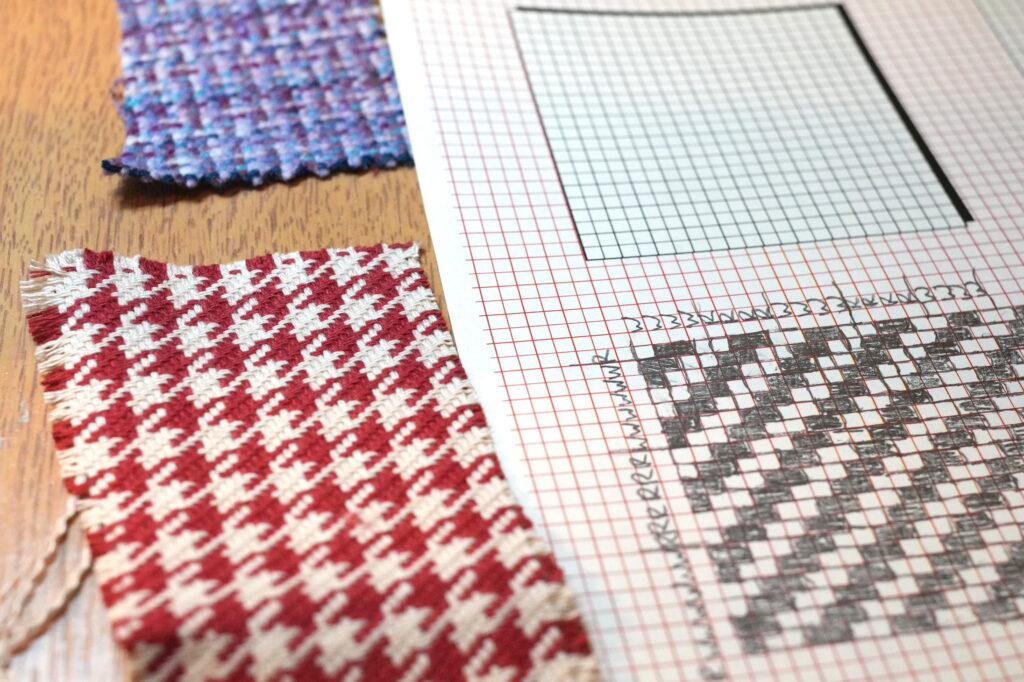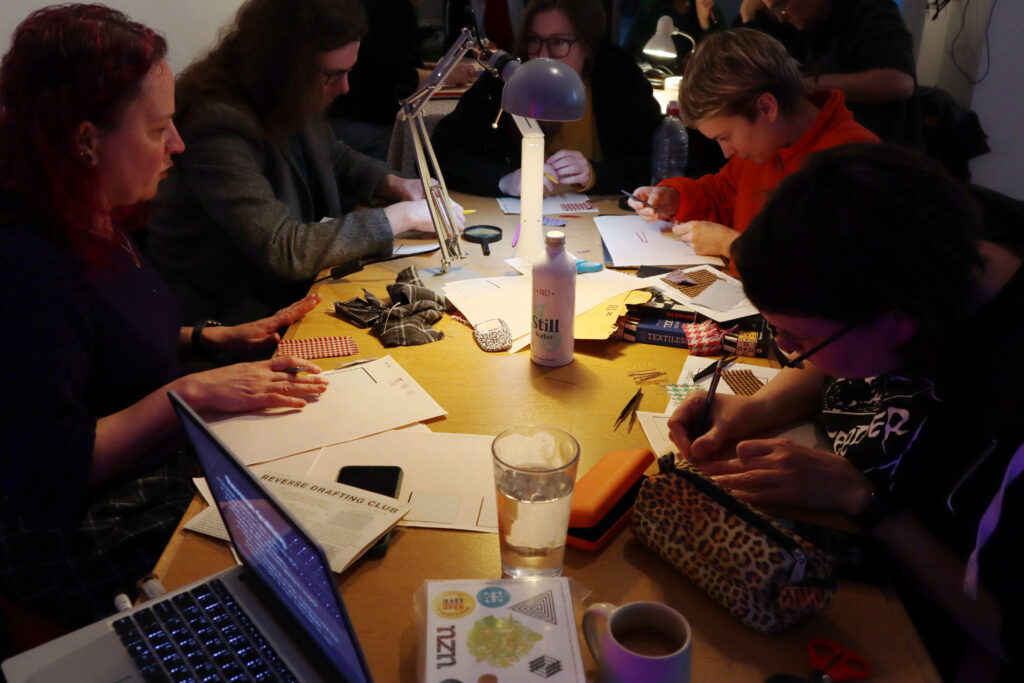 We had a lot of fun running an unweaving, aka “reverse drafting” workshop in Sheffield last Tuesday! This was inspired by a workshop Alex helped run with Ellen Harlizius-Klück and Dave Griffiths back in 2014, and more recently the ongoing “reverse drafting club” run out of Chicago with international participants. The idea is to pick apart woven fabric, to understand how the weave structure and thread colours interact. This can be a really puzzling and surprising experience which can really open your mind to textile structure. We focussed on houndstooth patterns, but with some others mixed in too. Some of the textiles were handwoven samples that are very expensive by the metre, but where you can order sample swatches online for a pound or two.